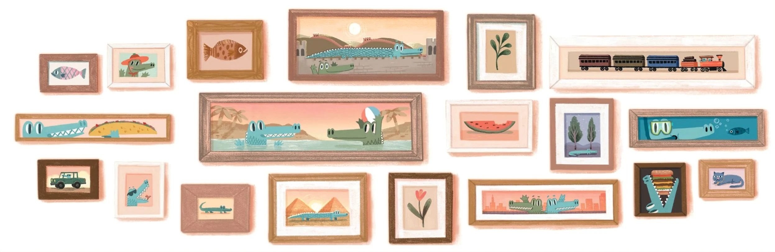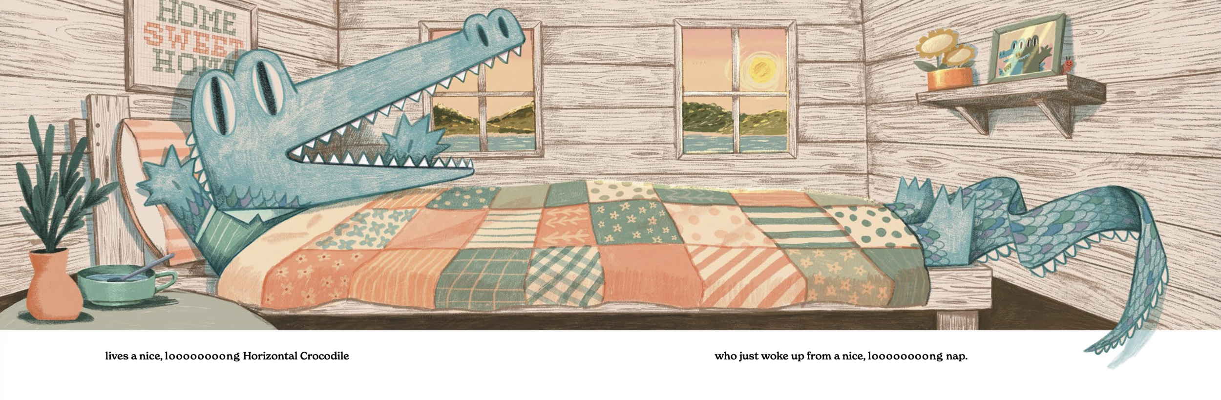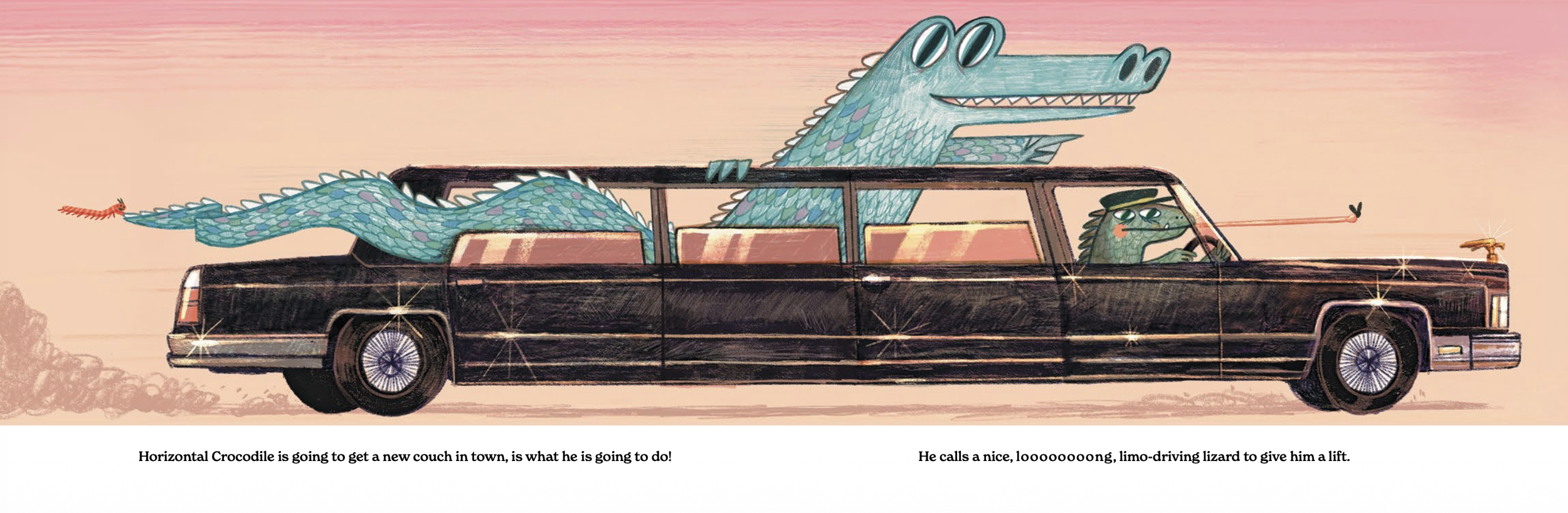 Once Scott had the idea of a loooooong crocodile in a looooong world, things moved fast. Turns out, being that long comes with a lot of problems. And we were fortunate enough to get a wide trim size that let those long spreads really breathe. Thanks to Celia Lee, Executive Editor, and Chloe Foglia, Art Director, for letting our very long crocodile have room to stretch.